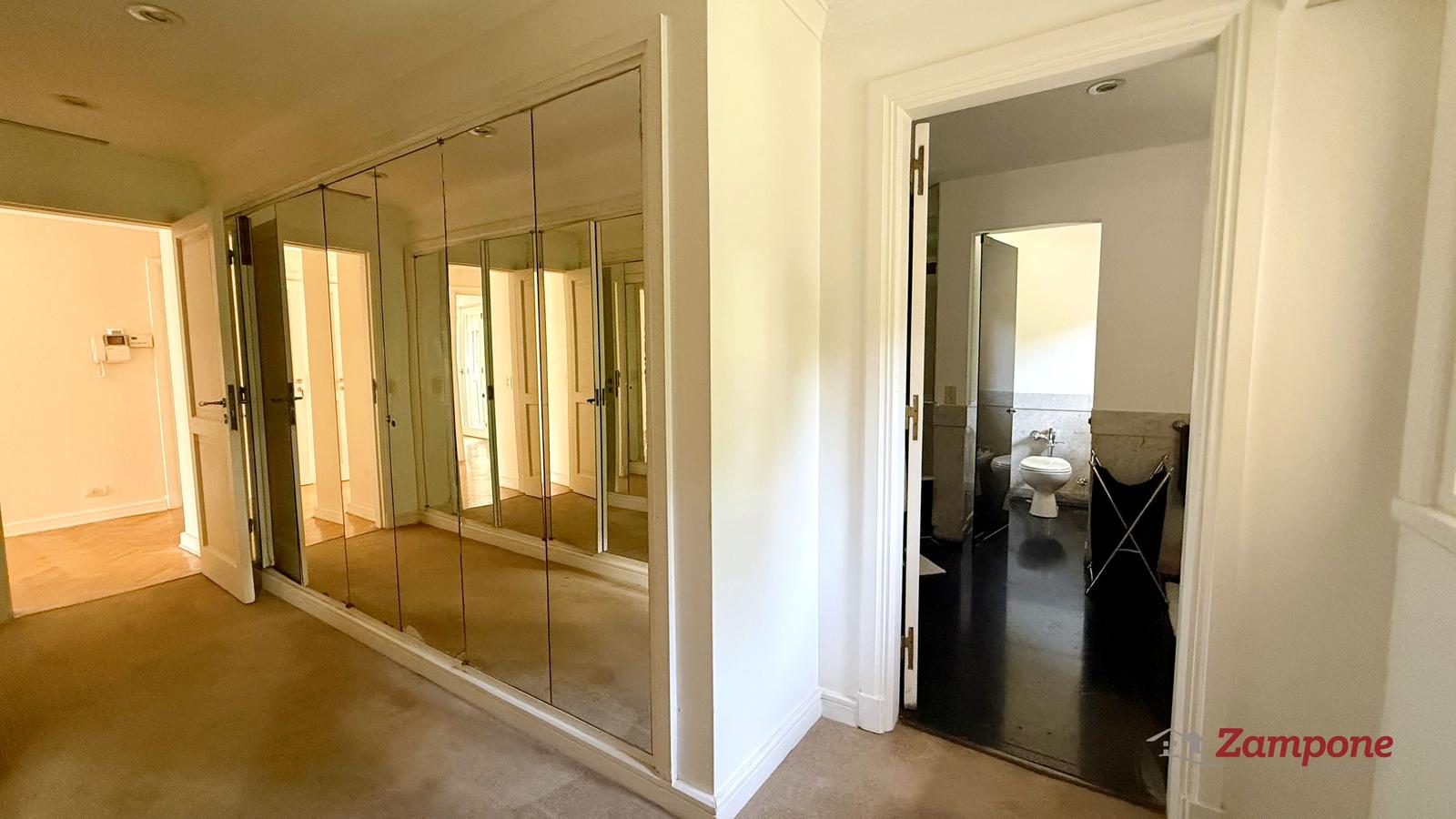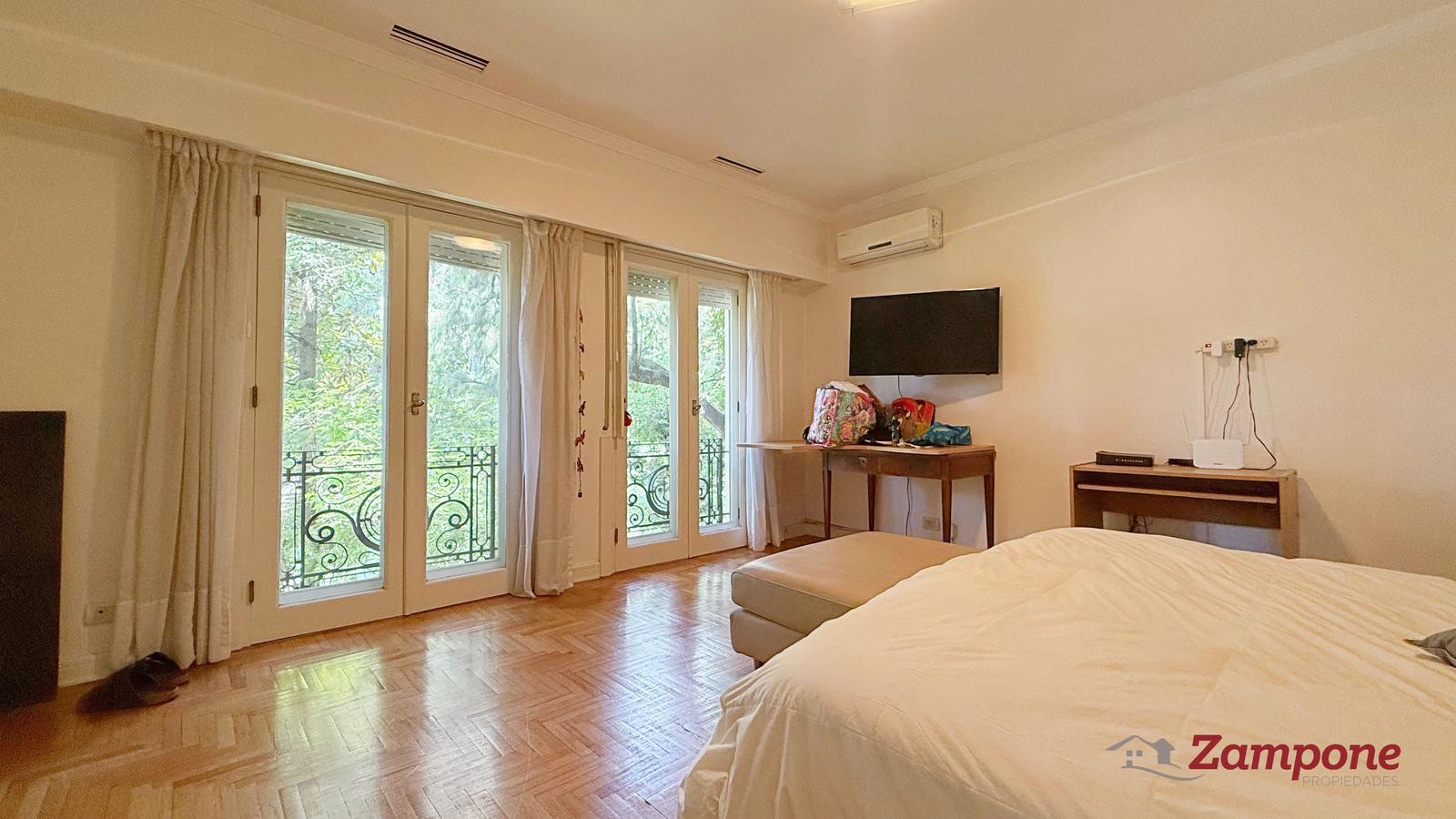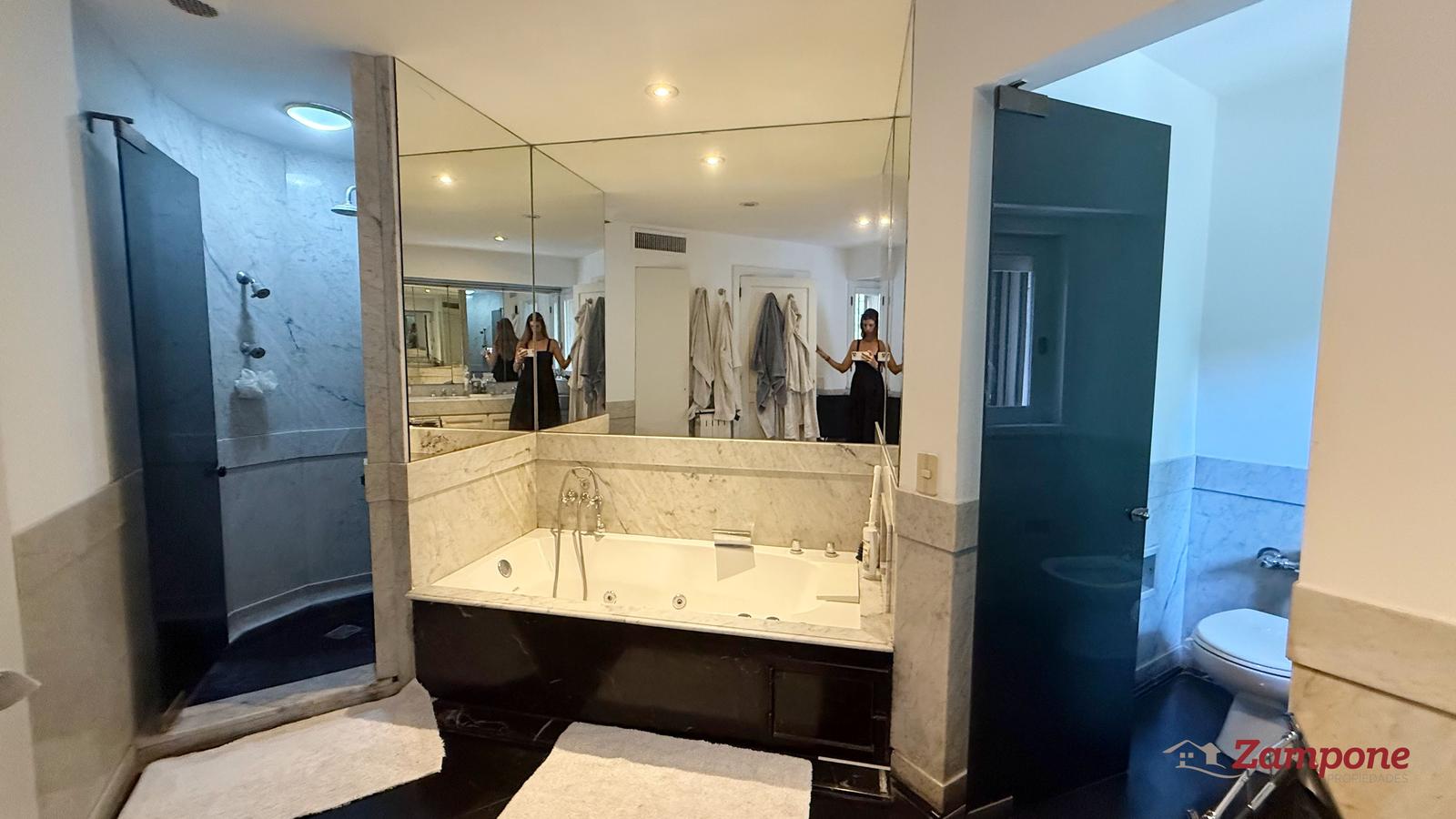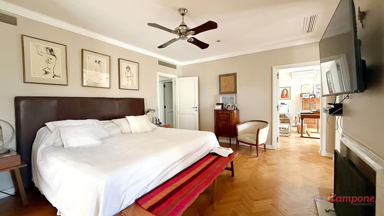 Dormitorio principal en suite, de generosas dimensiones, con chimenea, salida al balcón y doble vestidor. Baño con ducha y bañadera compartimentadas.