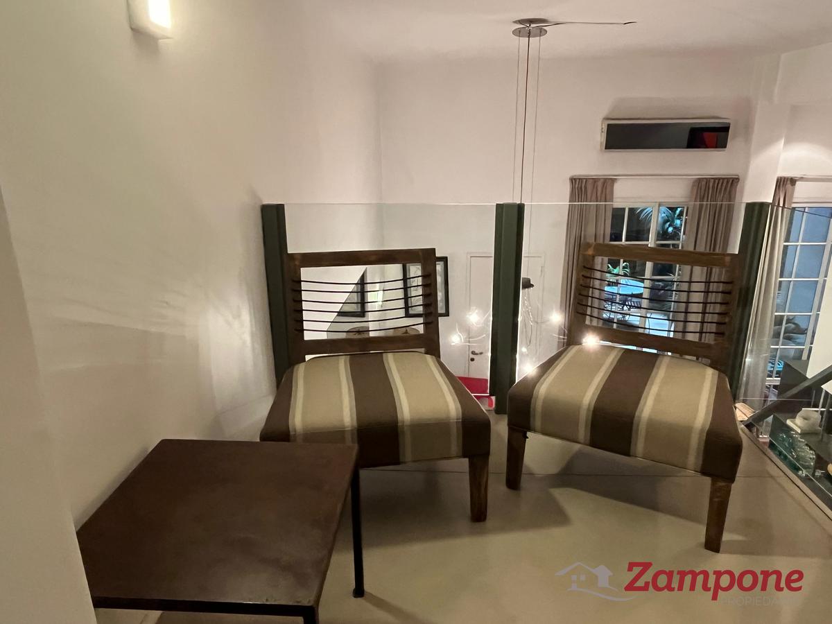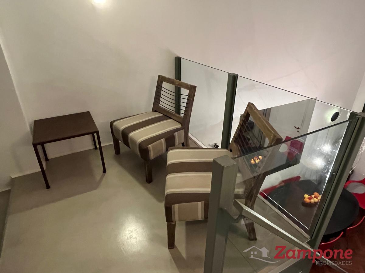 Recepción con un comedor para 6 personas y en el living un sofá cama de 2 plazas. Baño completo Amplio dormitorio con una televisión. Escalera cerca de la recepción que conduce al entrepiso a una habitación con baño con ducha.