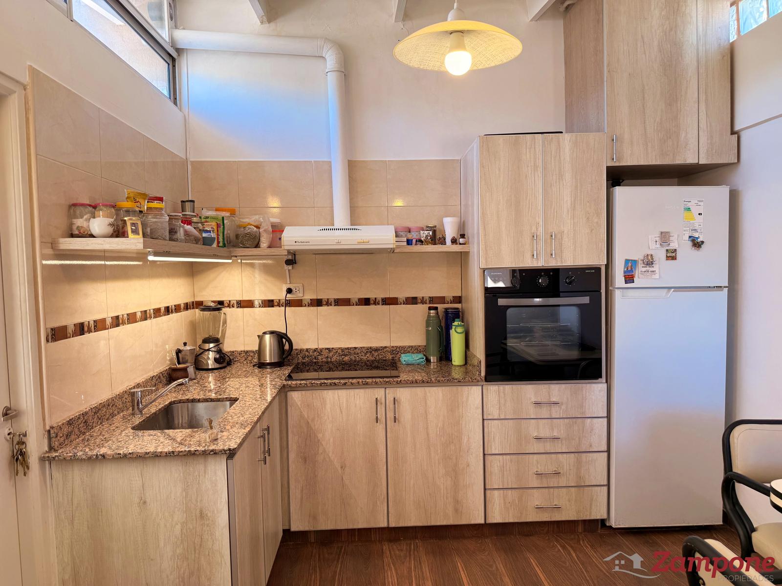 Distribución cómoda y funcional. La cocina-comedor hecha a nueva está equipada con muebles bajo mesada y alacena, proporcionando amplio espacio de almacenamiento.
