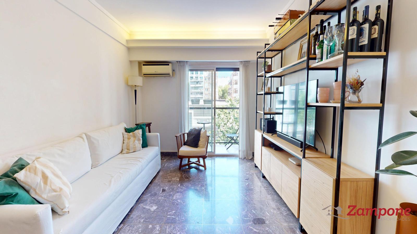 Living comedor (3,57 x 6 m) con salida a balcón de buen tamaño, aire acondicionado frío/calor y placa ecosol.