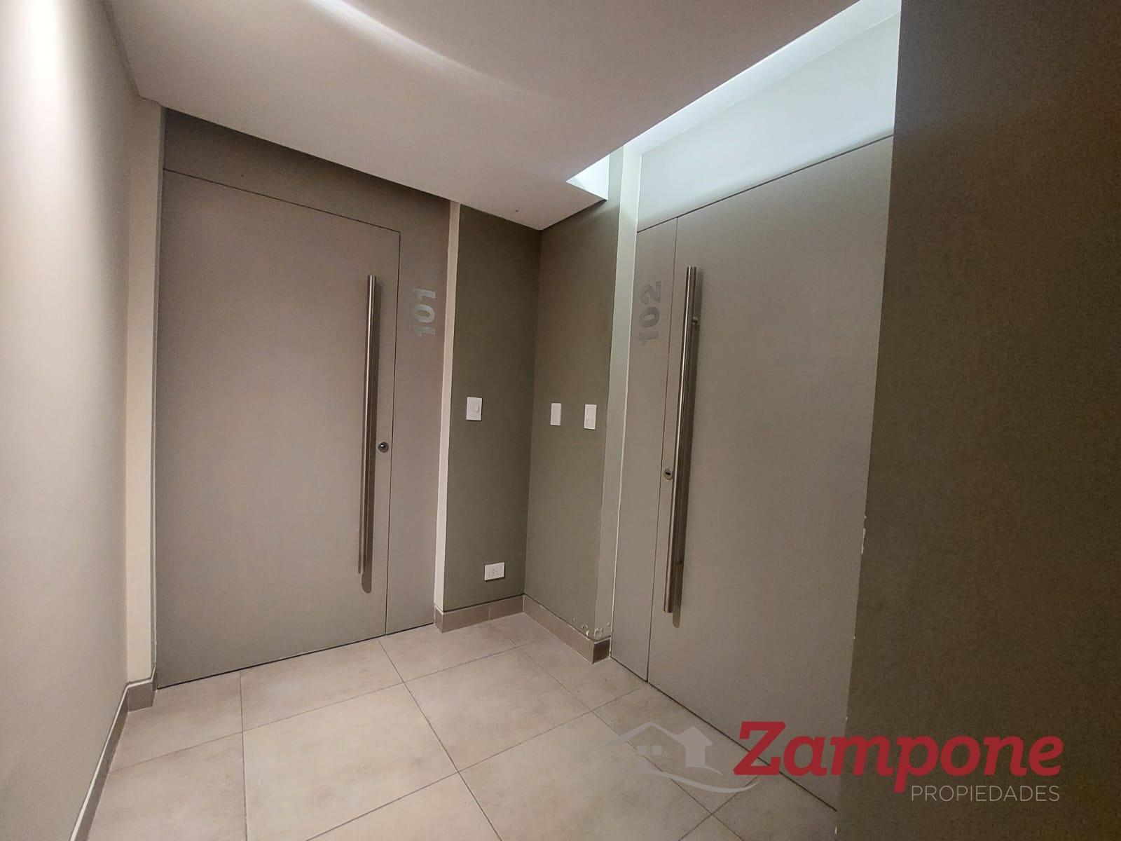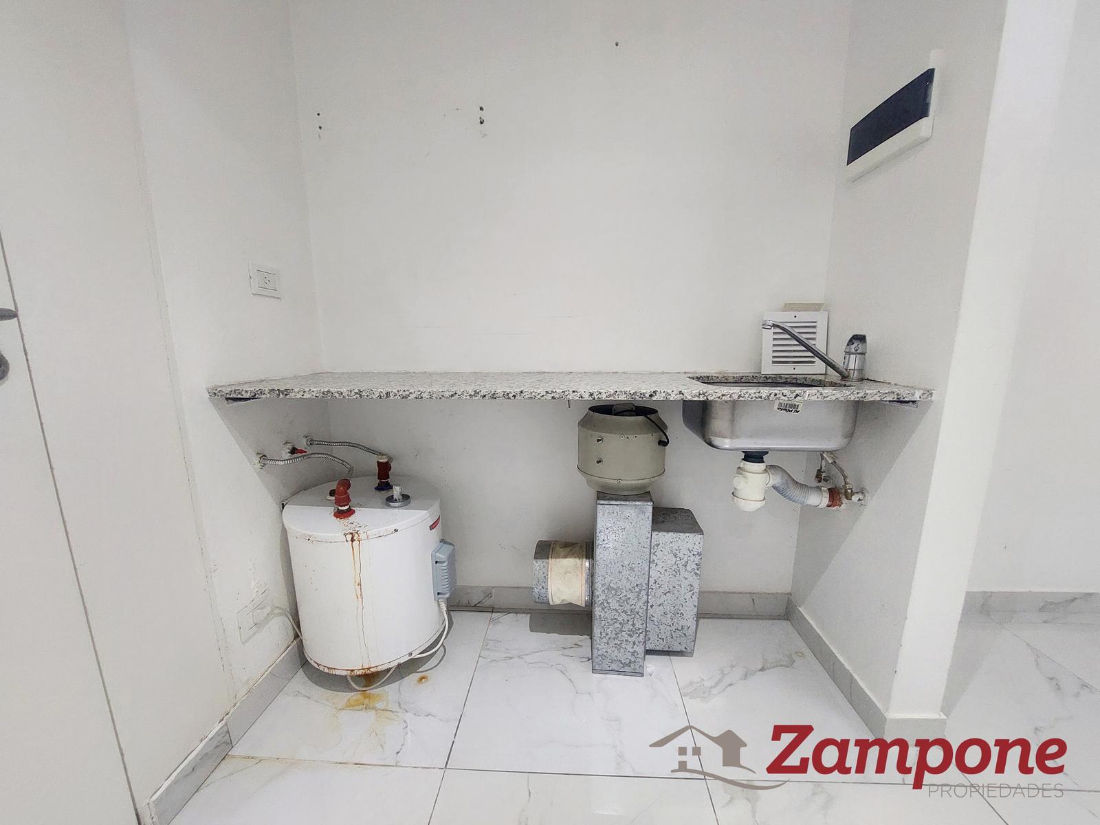 El ambiente cuenta con pisos de porcelanato, que aportan un toque moderno y elegante, y una cocina incorporada equipada con bacha y grifería monocomando.